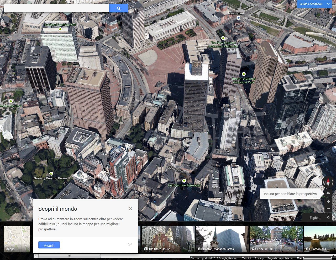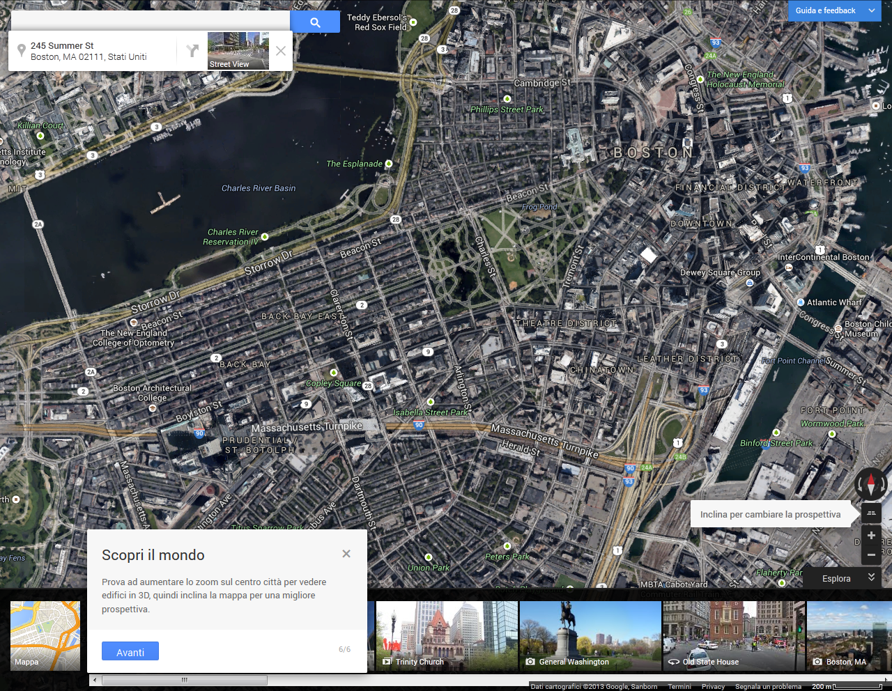 in basso a sinistra troviamo una icona denominata “Terra”.. Se fosse scritto “Earth” capiremmo al volo a che serve: a cambiare la vista in una in 3D, che integra le immagini satellitari a quelle degli edifici tridimensionali (al momento disponibili solo in alcune città), per un risultato che pare la fusione di Google Earth con Google Maps. Anche negli aspetti dell’ interfaccia si notano i tratti somatici di Earth: cercando un luogo che è già compreso nella visuale, la vista si porterà su di esso a volo di uccello, in modo analogo a quanto avviene su Google Earth, così come il carosello inferiore di fotografie geolocalizzate.