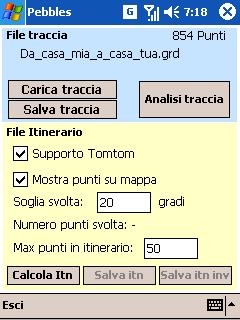 Nato da una collaborazione emme-Galileo, scritto a quattro mani, Pebbles è una applicazione per PocketPC che, a partire da una traccia memorizzata in vari formati, consente di generare un itinerario da utilizzarsi in Tomtom. L’itinerario può essere sia “diretto” (cioè nella direzione in cui il percorso è stato effettuato, sia “inverso” (cioè nella direzione opposta in cui il percorso è stato effettuato). Il programma consente inoltre di convertire il percorso in diversi formati, e di visualizzare graficamente informazioni sul percorso, come il profilo di altidudine o velocità in funzione del tempo di percorrenza o della distanza percorsa, nonché di visualiizare il percorso stesso.