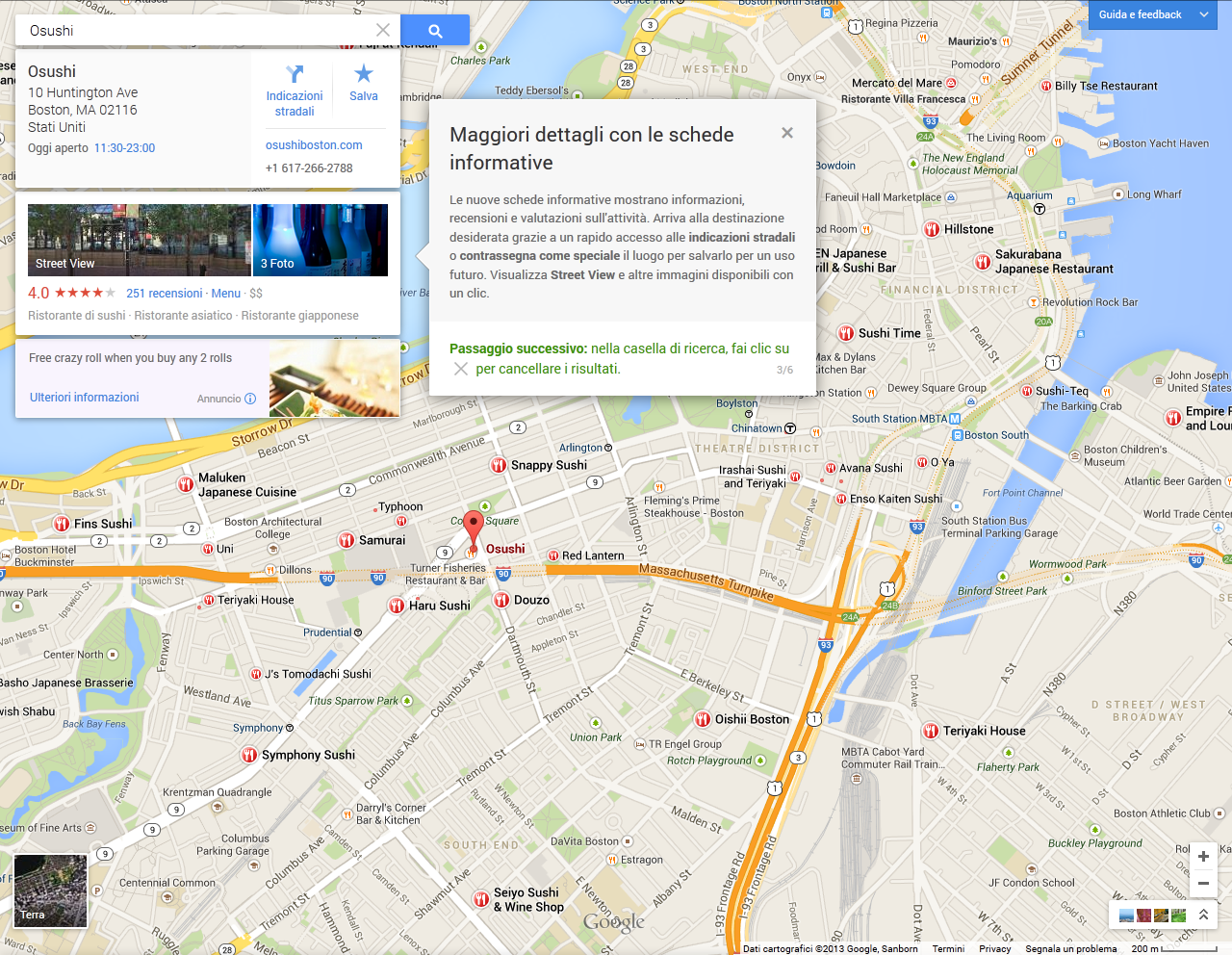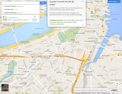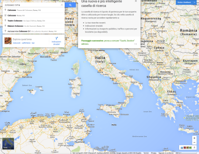 I primi cambiamenti saltano all’ occhio proprio qui: è scomparsa la classica barra laterale sinistra ove venivano presentati i risultati della ricerca, per fare posto alle mappe, ora in fullscreen. I risultati vengono presentati direttamente sulla mappa, tramite appositi segnaposto. La stringa di ricerca è in alto a sinistra, sovrapposta alla mappa, così come appariranno le varie informazioni che ci serviranno. Niente più “fumetti”, quindi, ma pratiche schede che richiameranno anche tour fotografici (con foto caricate fagli utenti Panoramio), Street View in full screen, indicazioni stradali, recensioni ecc.