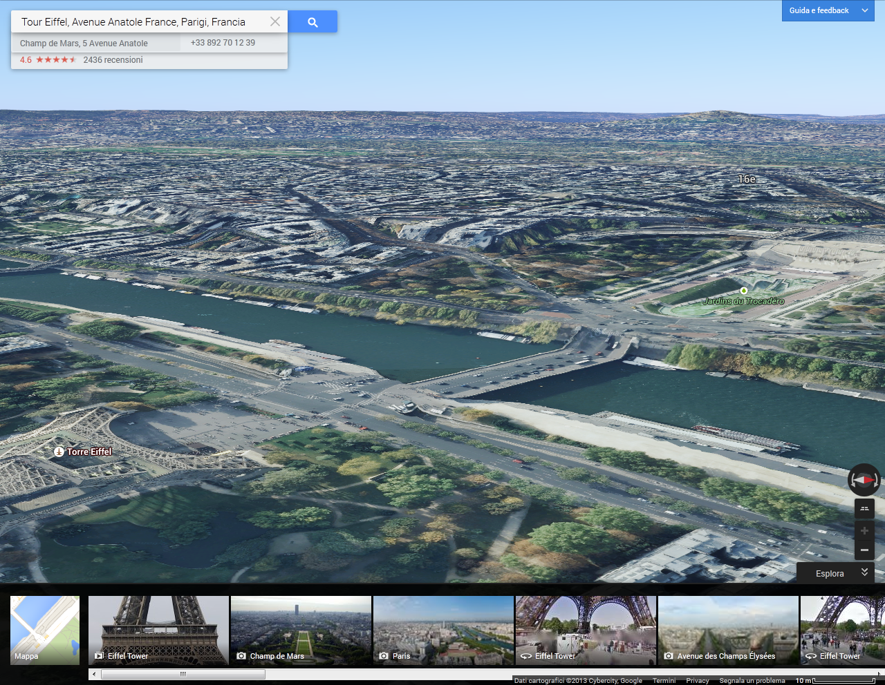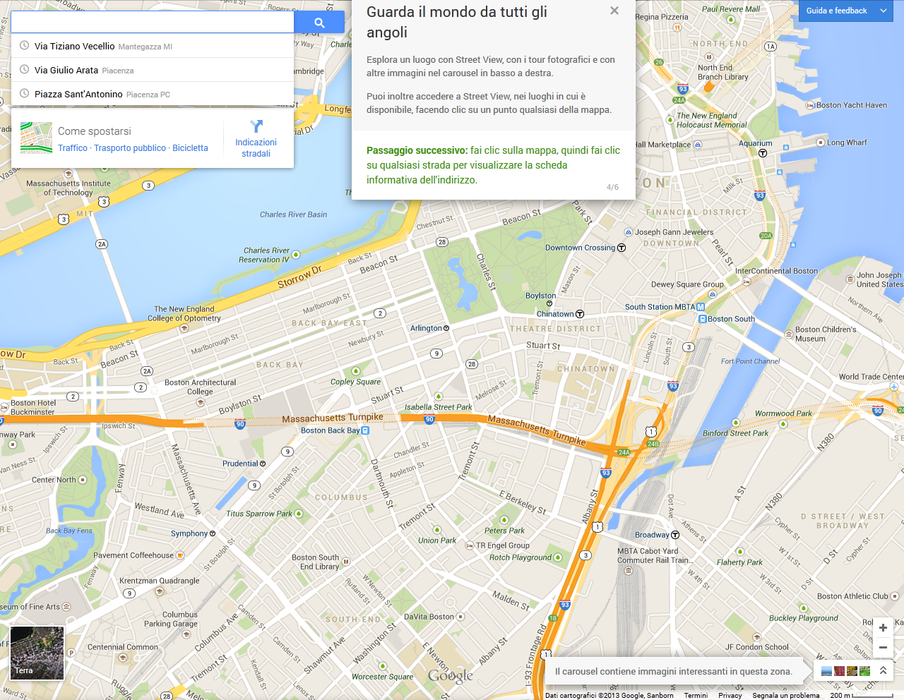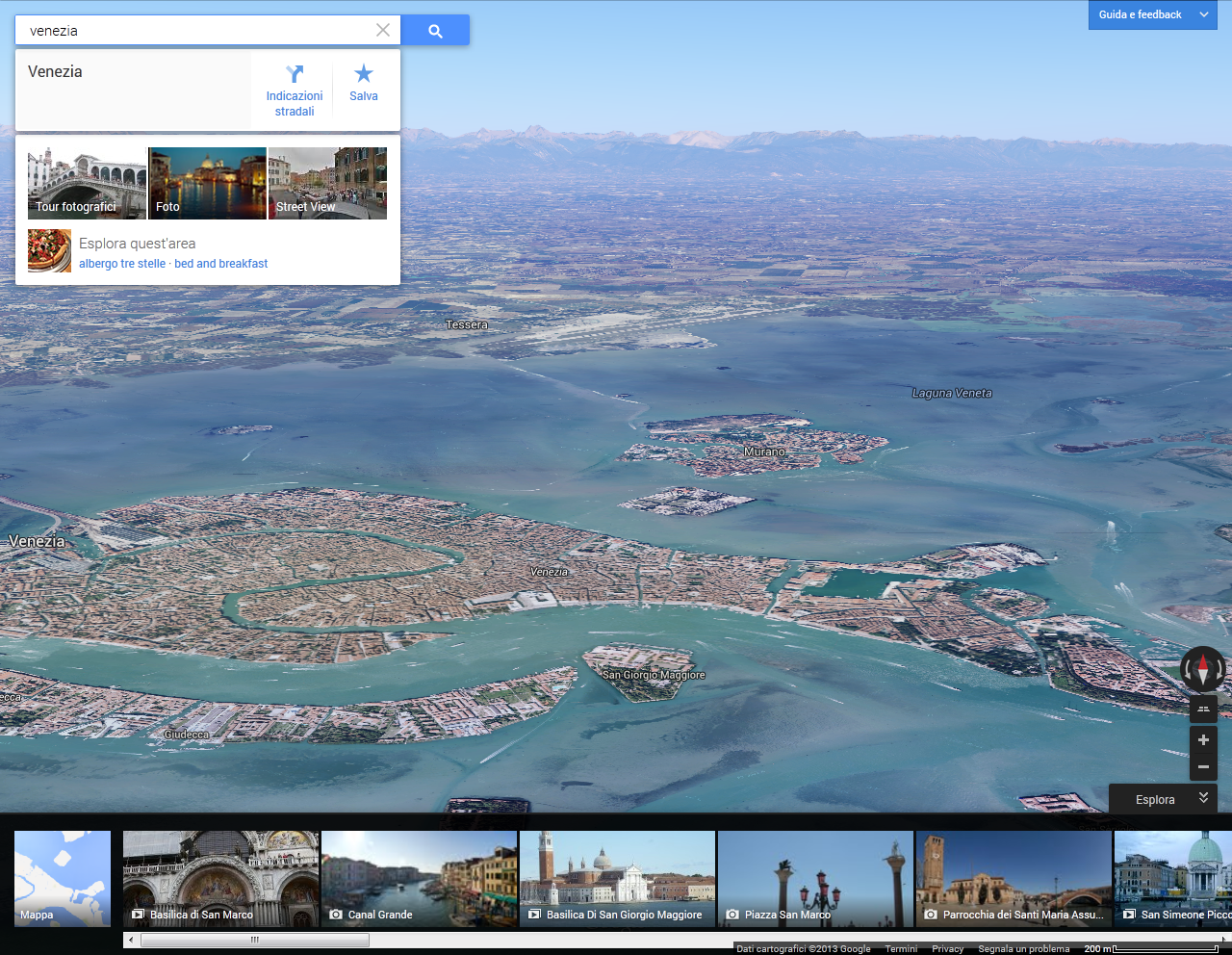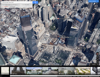 in basso a sinistra troviamo una icona denominata “Terra”.. Se fosse scritto “Earth” capiremmo al volo a che serve: a cambiare la vista in una in 3D, che integra le immagini satellitari a quelle degli edifici tridimensionali (al momento disponibili solo in alcune città), per un risultato che pare la fusione di Google Earth con Google Maps. Anche negli aspetti dell’ interfaccia si notano i tratti somatici di Earth: cercando un luogo che è già compreso nella visuale, la vista si porterà su di esso a volo di uccello, in modo analogo a quanto avviene su Google Earth, così come il carosello inferiore di fotografie geolocalizzate.