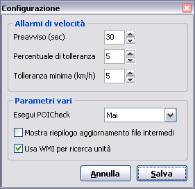 Se nei campi appositi sono indicati dei valori maggiori di zero, sul navigatore verrà indicata una velocità massima già comprensiva della tolleranza, ovvero se la velocità ammessa in un certo tratto è di 50 Km/h, il navigatore segnalerà 55 Km/h, in modo che l’allarme di superamento dei limiti venga attivato solo quando la velocità effettiva del mezzo, di norma di circa 5 Km/h inferiore a quanto segnalato dal tachimetro, supera anche la tolleranza da applicare per legge.