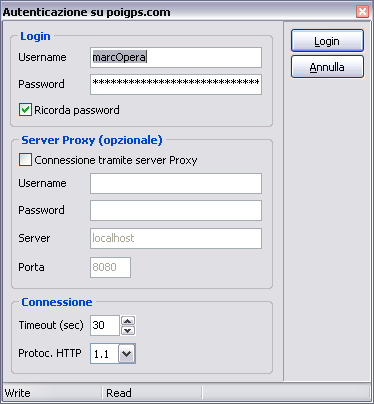 Non appena avviato il programma, compare la finestra di login, nella quale dovete autenticarvi con l’Username e la Password con la quale vi siete registrati su poigps.com: