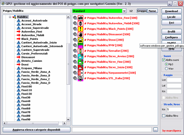 Il GPU riceve da poigps.com l’elenco dei file disponibili sul sito, aggiornando il box sinistro visibile nella videata principale del programma, nel quale vengono elencati i POI presenti, suddivisi per gruppo e categoria.