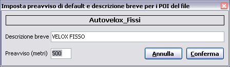 Il numero indicato corrisponde ai metri di preavviso di default, applicati per tutti i singoli POI che non contengono all’interno della descrizione l’indicazione della velocità espressa secondo la modalità standard di Garmin (@velocità)